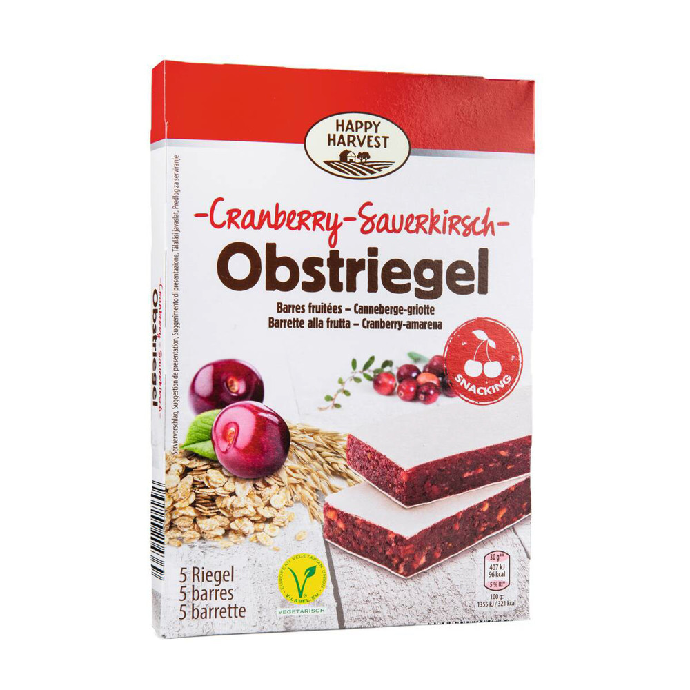 Перегляд Товару: Батончики Пластівці з злаками Happy Harvest Obstriegel Cranberry Пастіла з журавлиною 5шт 150г