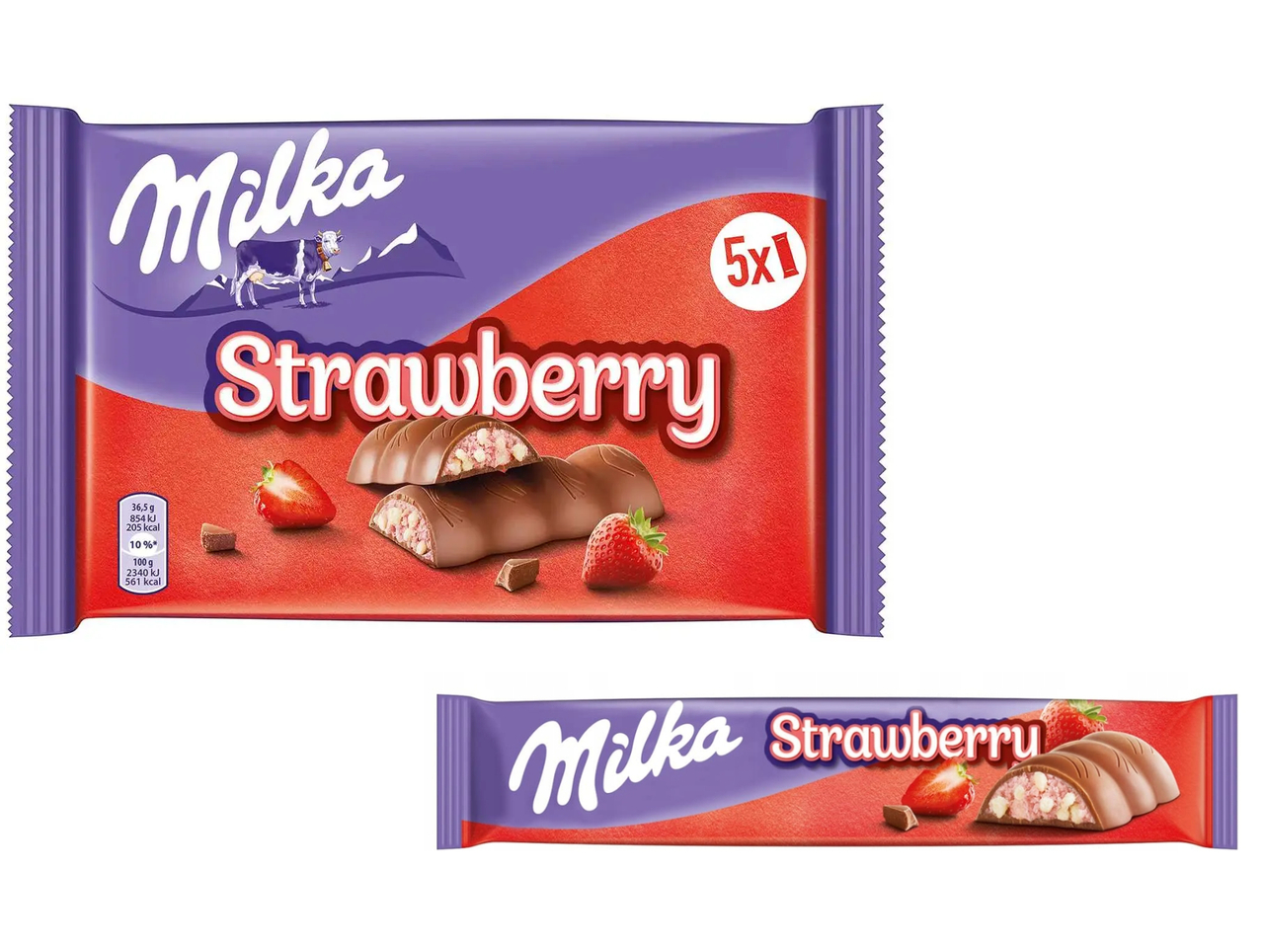 Перегляд Товару: Батончики з молочного шоколаду Milka Strawberry Riegel з начинкою із полуничного та вершкового крему з злаками 5шт 182г