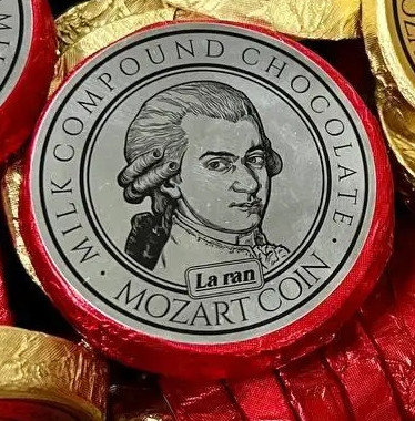 Перегляд Товару: Цукерка шоколадна Монета Laran Dark Milk Compound Chocolate Mozart Coin Red Ларан Моцарт темномолочна в Червонозолотій Фользі 22г