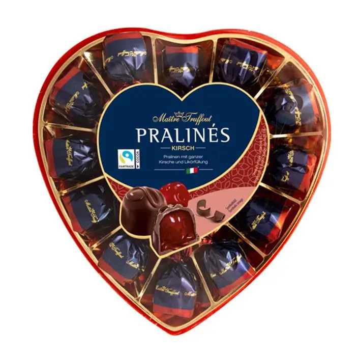 Перегляд Товару: Цукерки шоколадні Вишня в лікері Maitre Truffout Pralines Kirsch Подарунковий Бокс Сердечко 165г