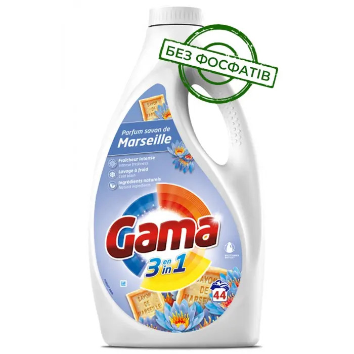 Перегляд Товару: Гель для прання Універсальний Gama Marseille Parfum savon 3in1 Гама аромат Марсельського мила безфосфатний 44прань 1980мл