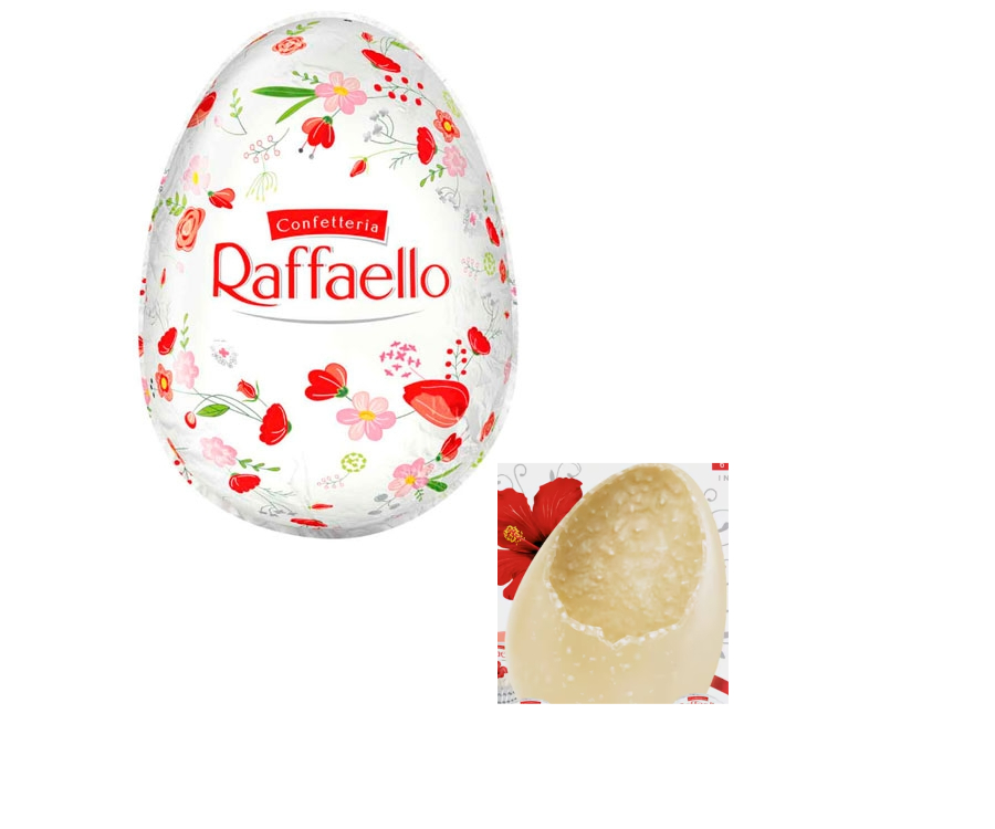 Перегляд Товару: Яйце шоколадне Великоднє Raffaello Confetteria Easter Egg Big Рафаело Пасхальне Білий шоколад Кокос мигдаль в фользі Велике 100г