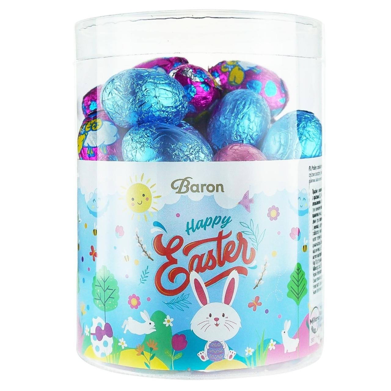 Перегляд Товару: Яйця Шоколадні Великодні Baron Happy Easter Chocolate Eggs Барон Пасхальні з праліне Асорті Туба з кришкою 20шт 450г