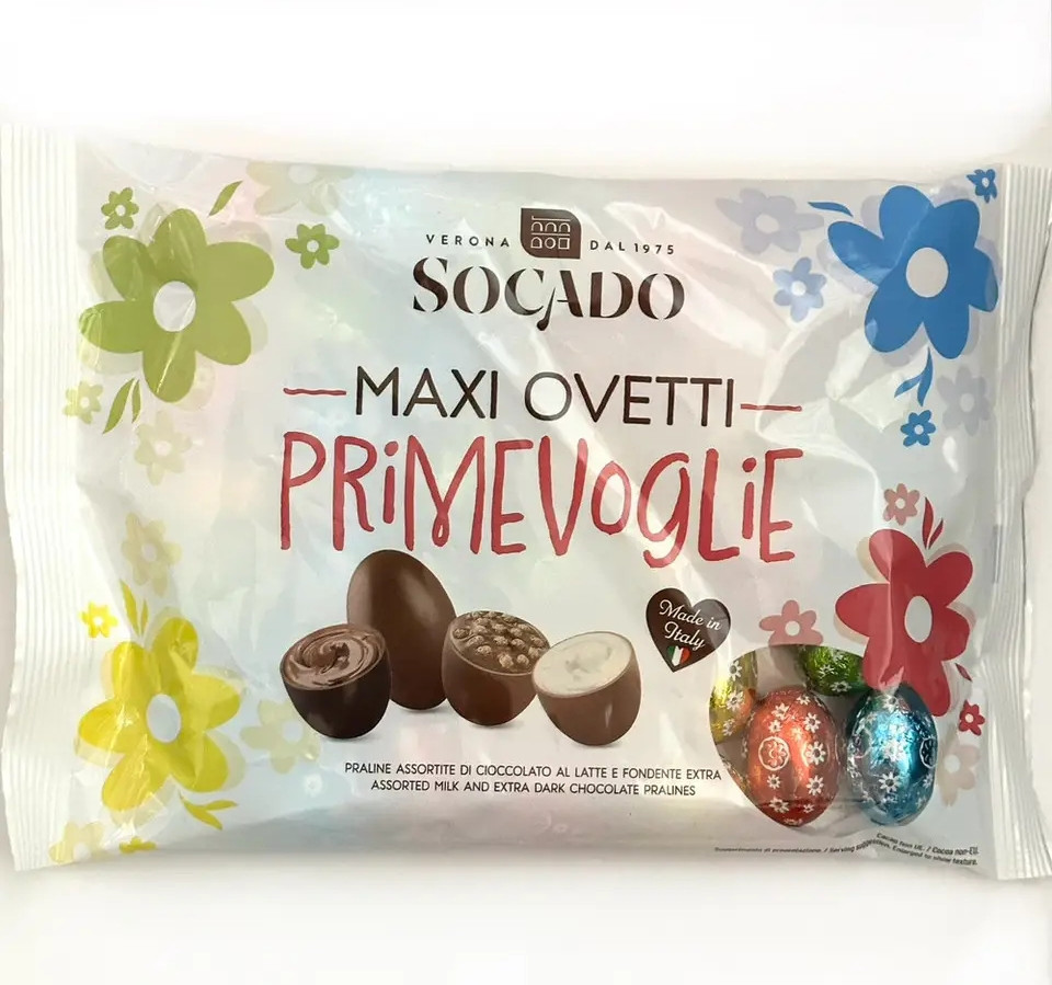 Перегляд Товару: Яйця Шоколадні Великодні Socado Ovetti Maxi Ovetti Primevoglie Assortiti Сокадо Оветті Пасхальні в фользі Асорті Пакет 450г