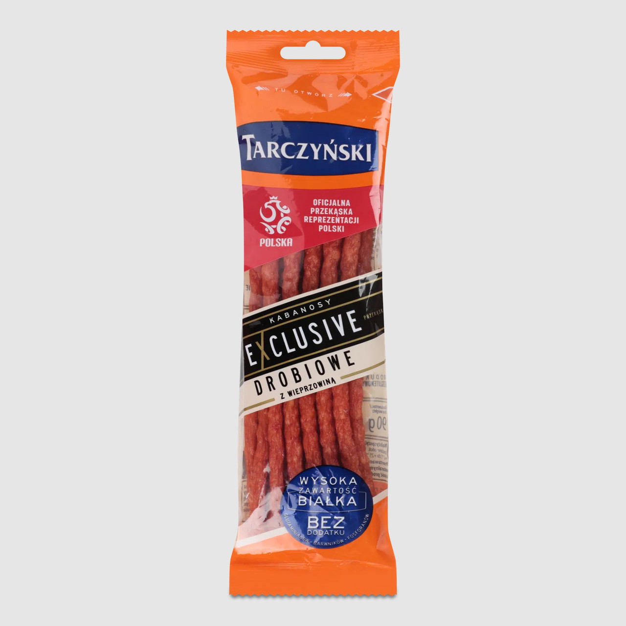 Перегляд Товару: Ковбаски Кабаноси копчені Tarczynski Kabanosy Drobiowe z Wieprzowina Exclusive Таржинські снеки Свинина з Птицею Стрічка 8шт 90г