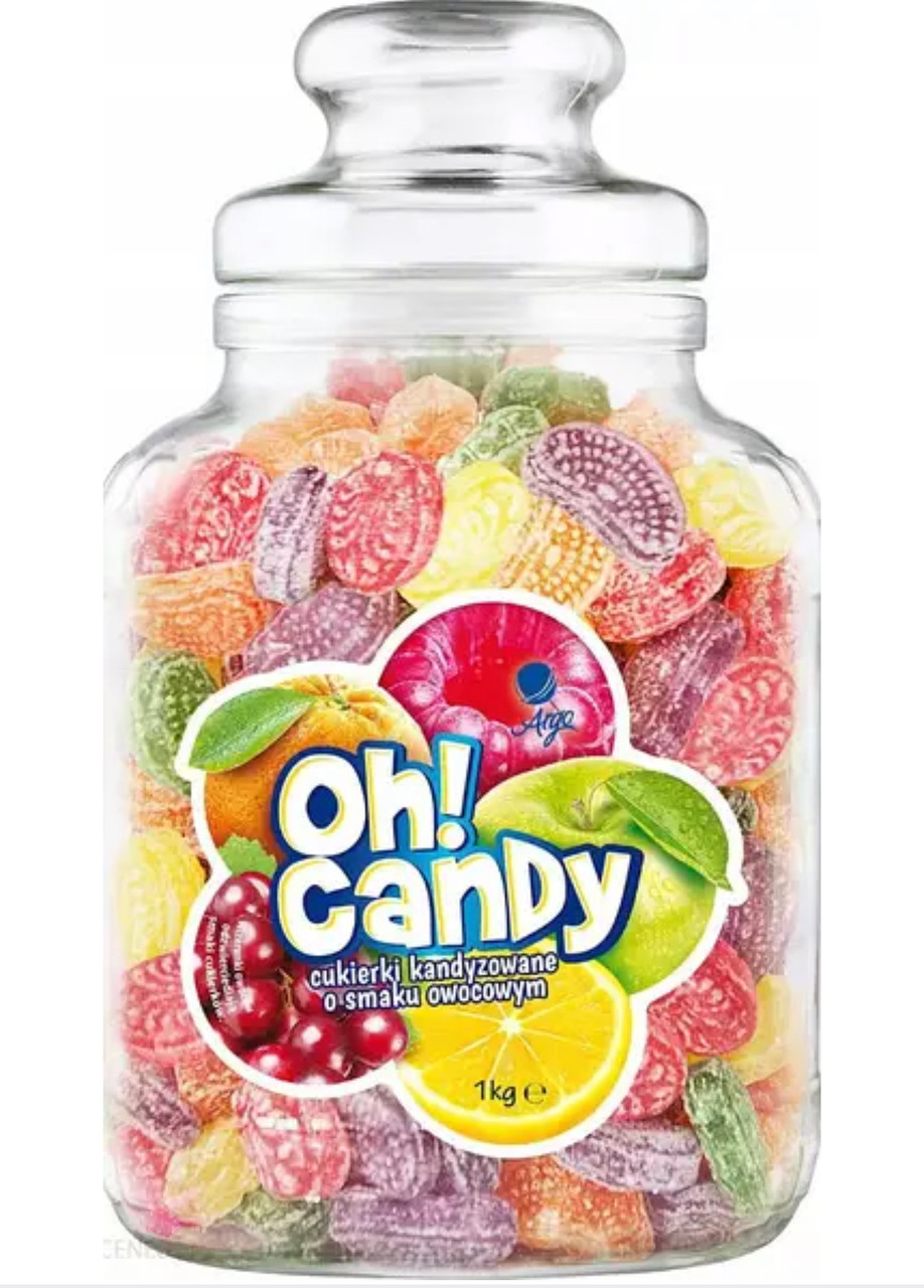 Перегляд Товару: Льодяники цукерки смоктальні Argo Oh Candy Fruits Mix фруктовий мікс у великій скляній банці 1кг