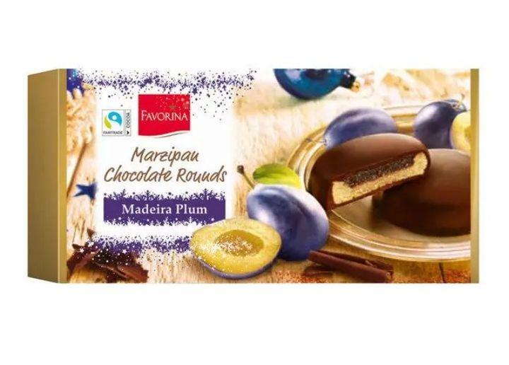 Перегляд Товару: Марципан у шоколаді Favorina Marzipan Сhocolate Rounds Madeira Plums Фаворіна Шоколадні Кружечка з смаком Сливи Коробка 10шт 300г