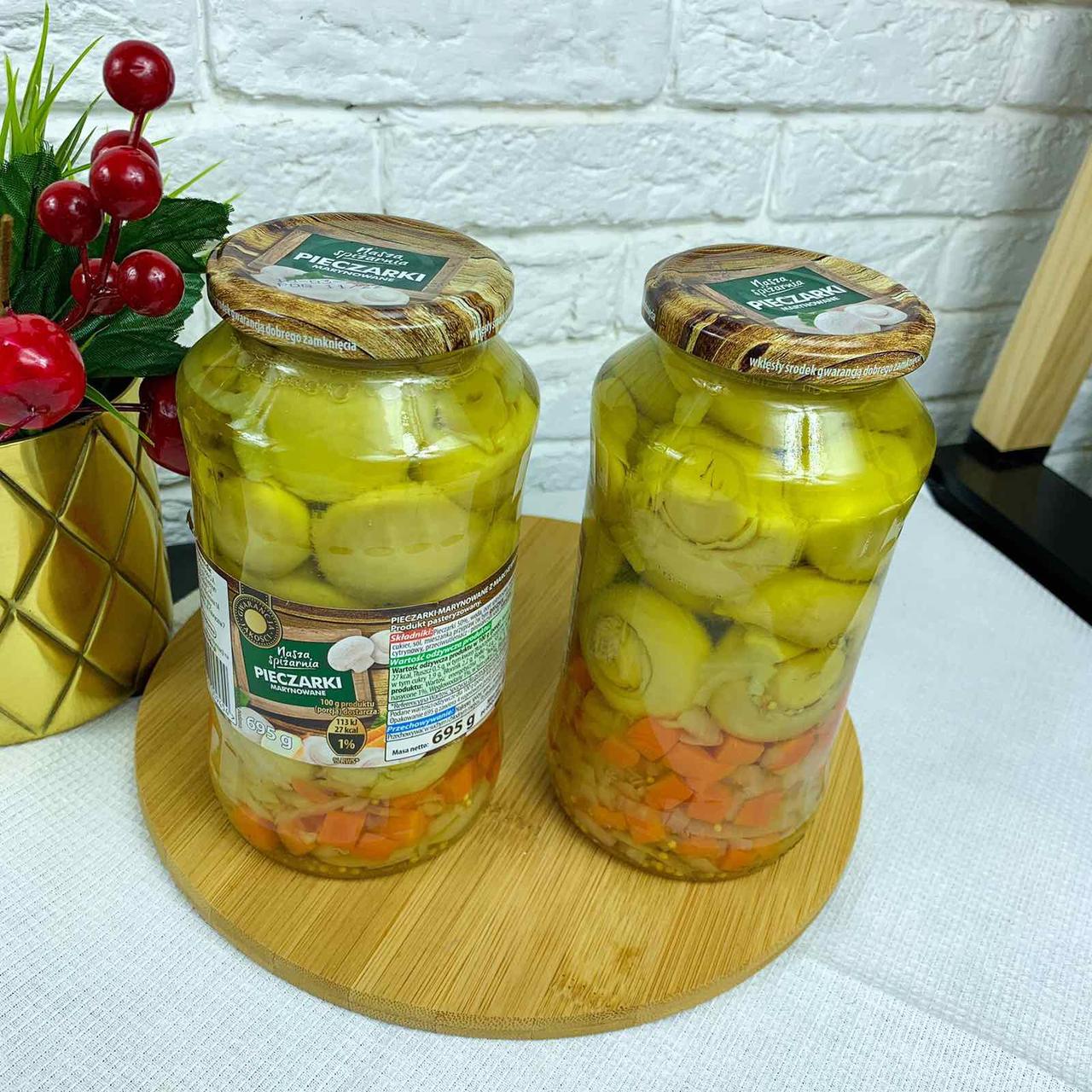Перегляд Товару: Мариновані шампіньйони з цибулею й морквою. вага 695г.