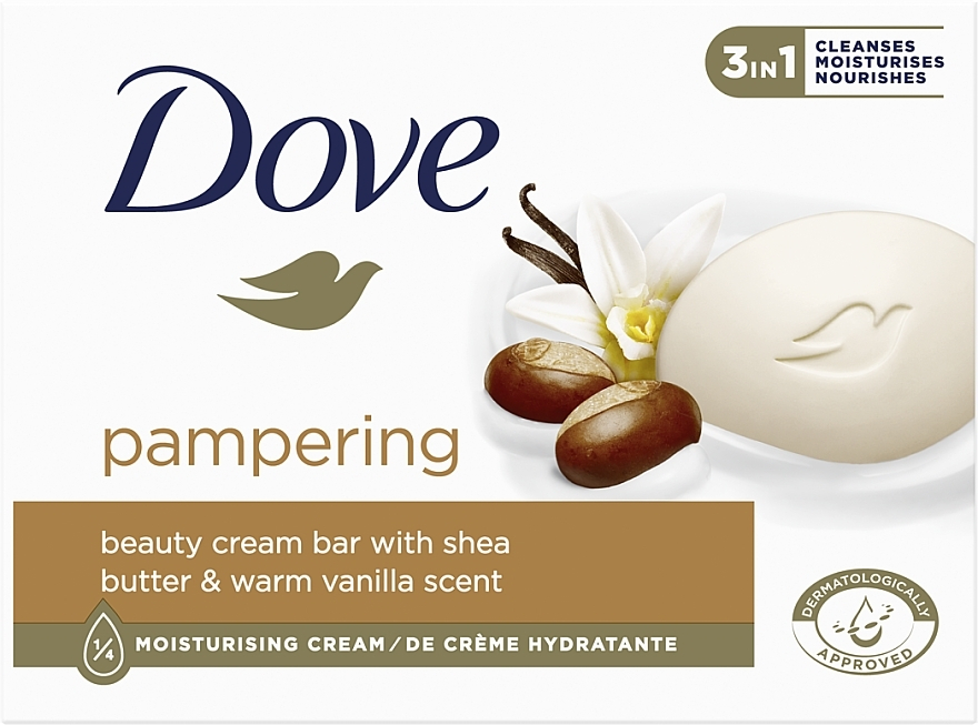 Перегляд Товару: Мило-крем кускове Dove Pampering 3in1 Moisturising Cream bar Shea butter Vanilla Дав 3в1 Балування з маслом Ши та Ваніллю 90г