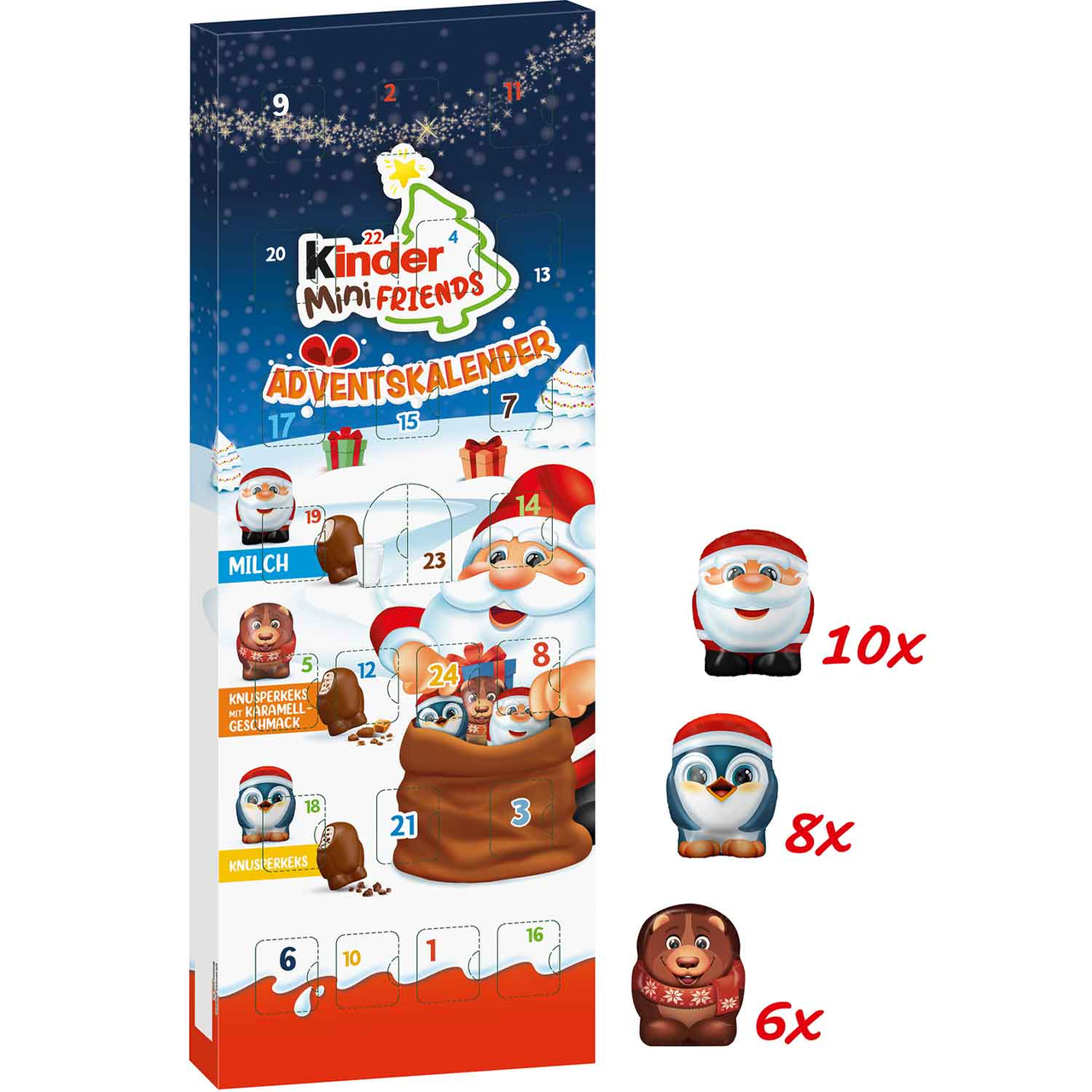 Состав: Шоколадна цукерка фігурна Kinder Санта з молочною начинкою 10шт, Kinder Пінгвін з шматочками бісквіта 8шт, Kinder Ведмедик зі смаком карамелі 6шт