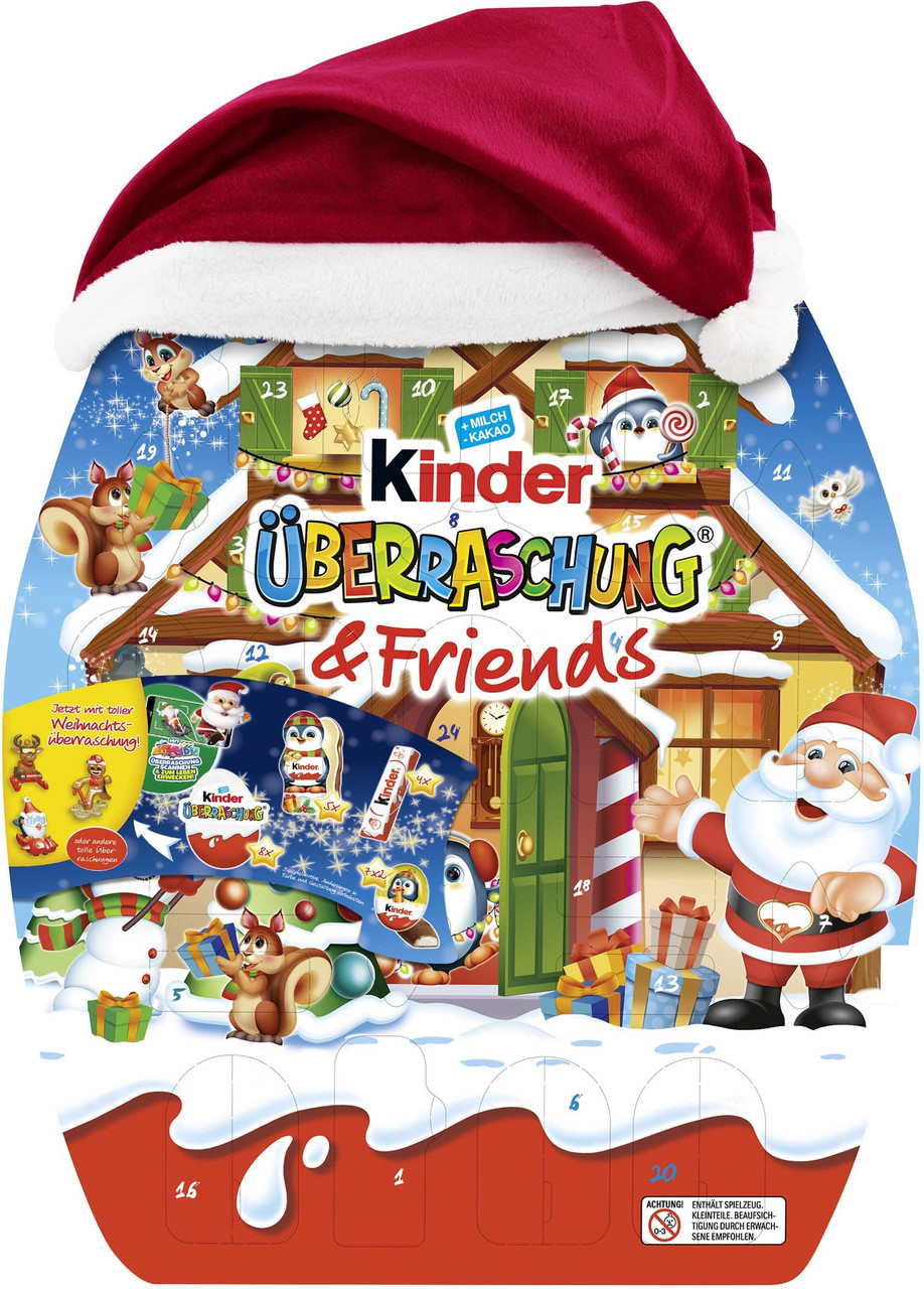 Состав: 8× Kinder Überraschungsei Surprise яйце,5× Kinder Schokolade Hohlfigur Пінгвін,10х Kinder Schokolade Mini,6x Kinder Schokolade,Новорічна шапка