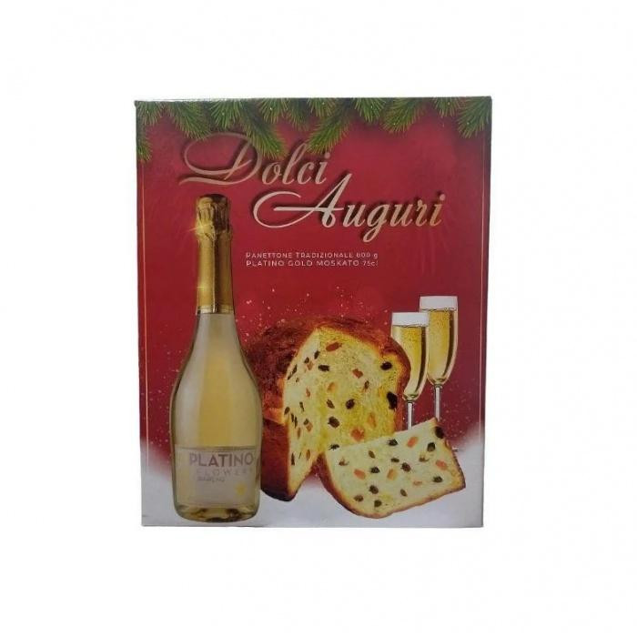 Состав: Великий традиційний італійський Панетон з родзинками Panetone Tradizionale 800г, Пляшка шампанського вина Platino Flowery Sparkling Gold Moscato 750мл.