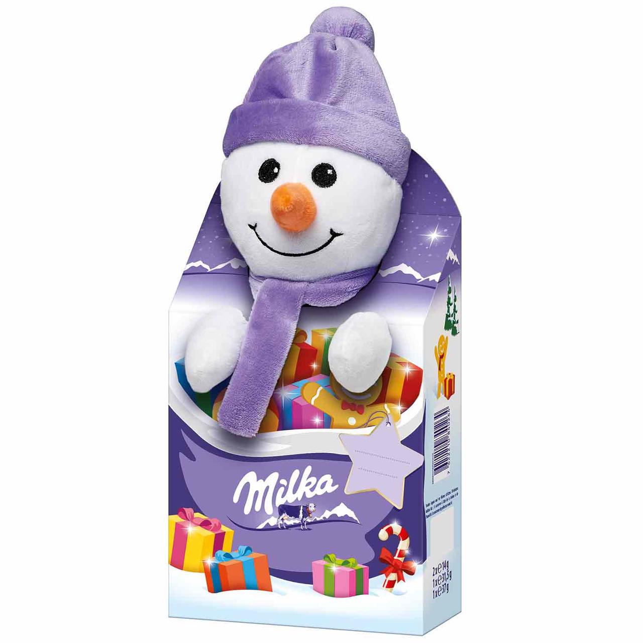 Новорічний подарунок Milka дитині milka plüschtier magic mix schneemann (м'яка іграшка зі солодощами), 133 г.
