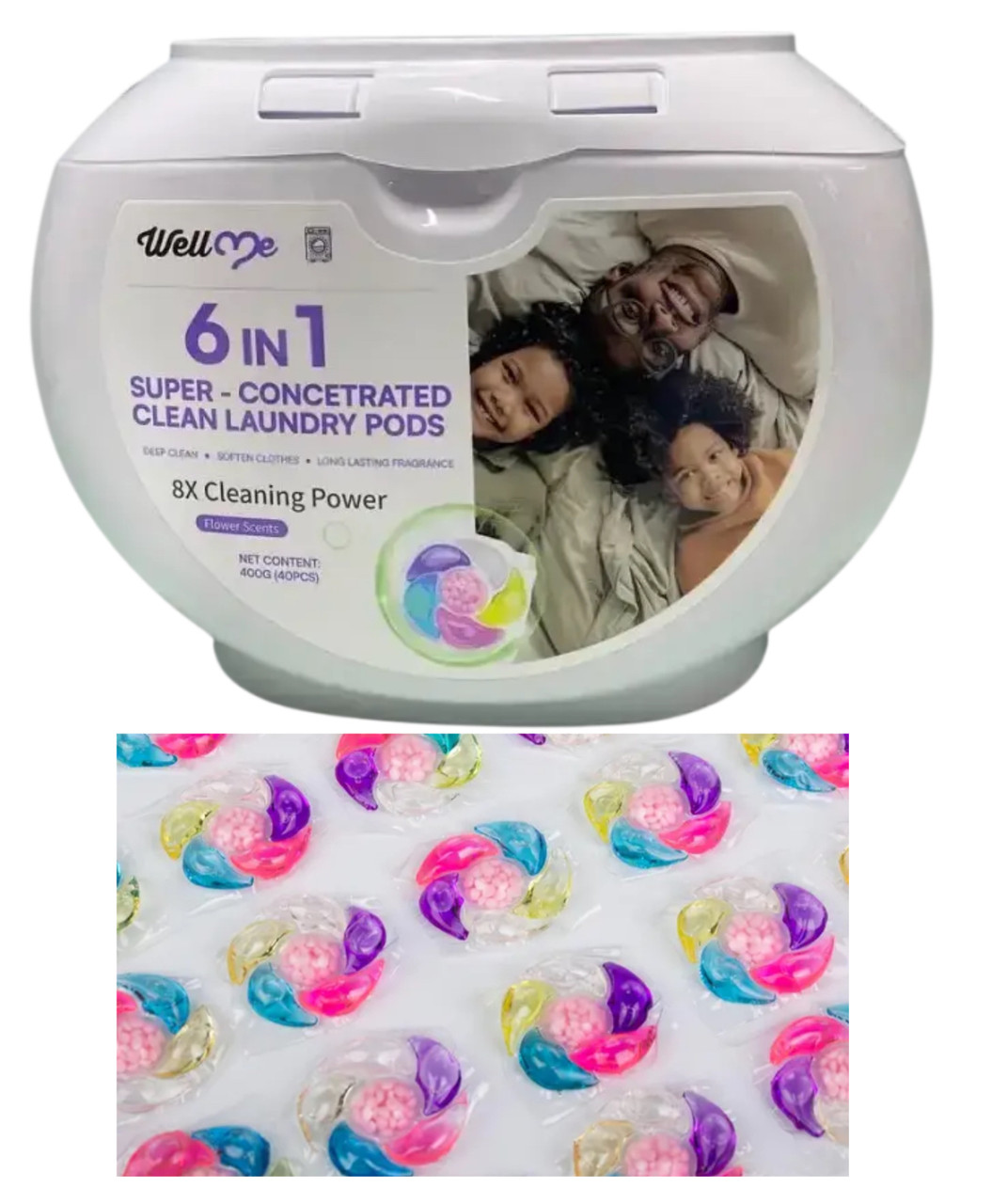 Перегляд Товару: Парфумовані капсули з гранулами для Прання WellMe 6в1 Super-concentrated Clean Laundry Pods Велмі Універсальні Квіти аромат 40шт