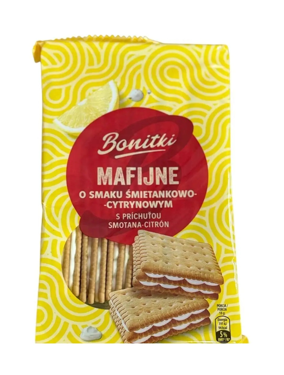 Перегляд Товару: Печиво Мафіни Сендвіч Biedronka Bonitki Mafijne Smietankowe Lemon Боніткі з Вершковим та Лимонним кремом потрійні 18шт 330г