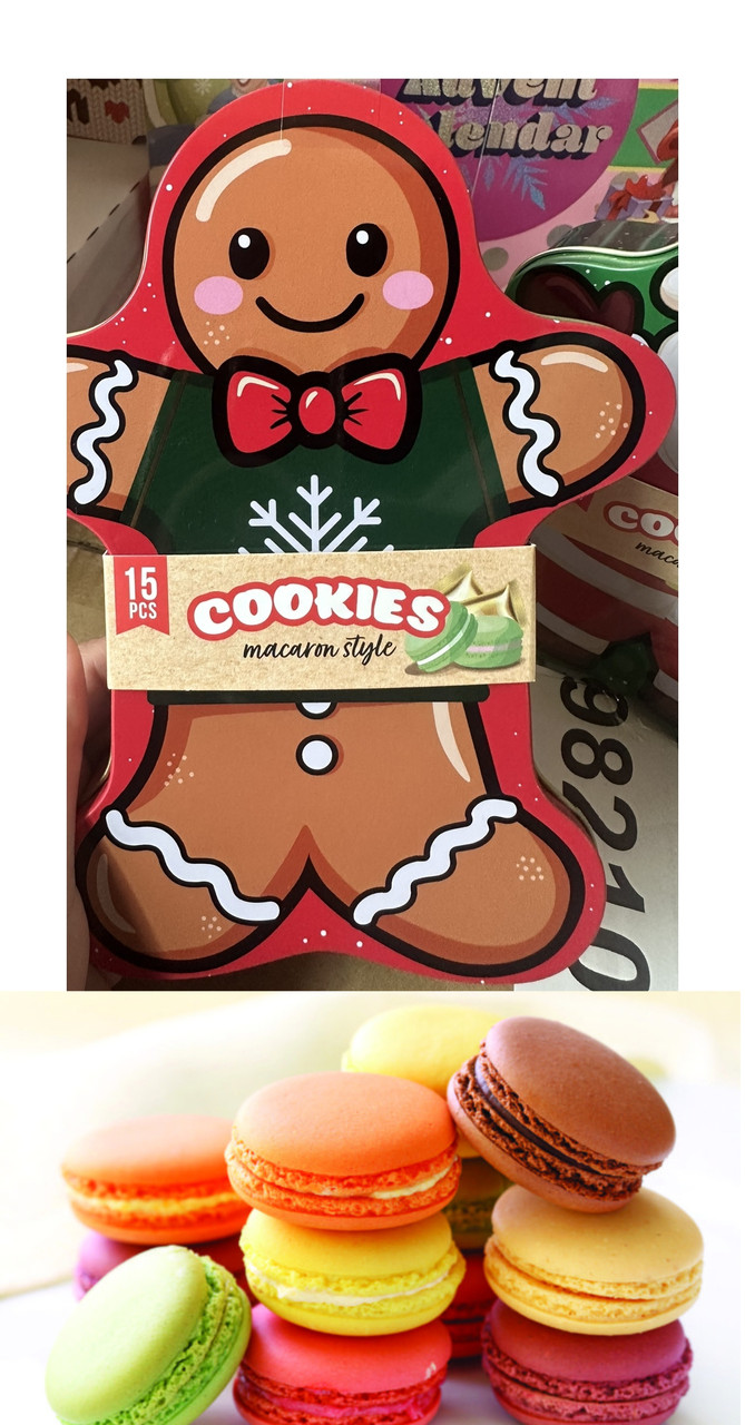 Перегляд Товару: Печиво макаруни Різдвяні Beckys Cookies macaron style Бекіс Святкові в Подарунковій металевій коробці Пряниковий чоловік 15шт 92г