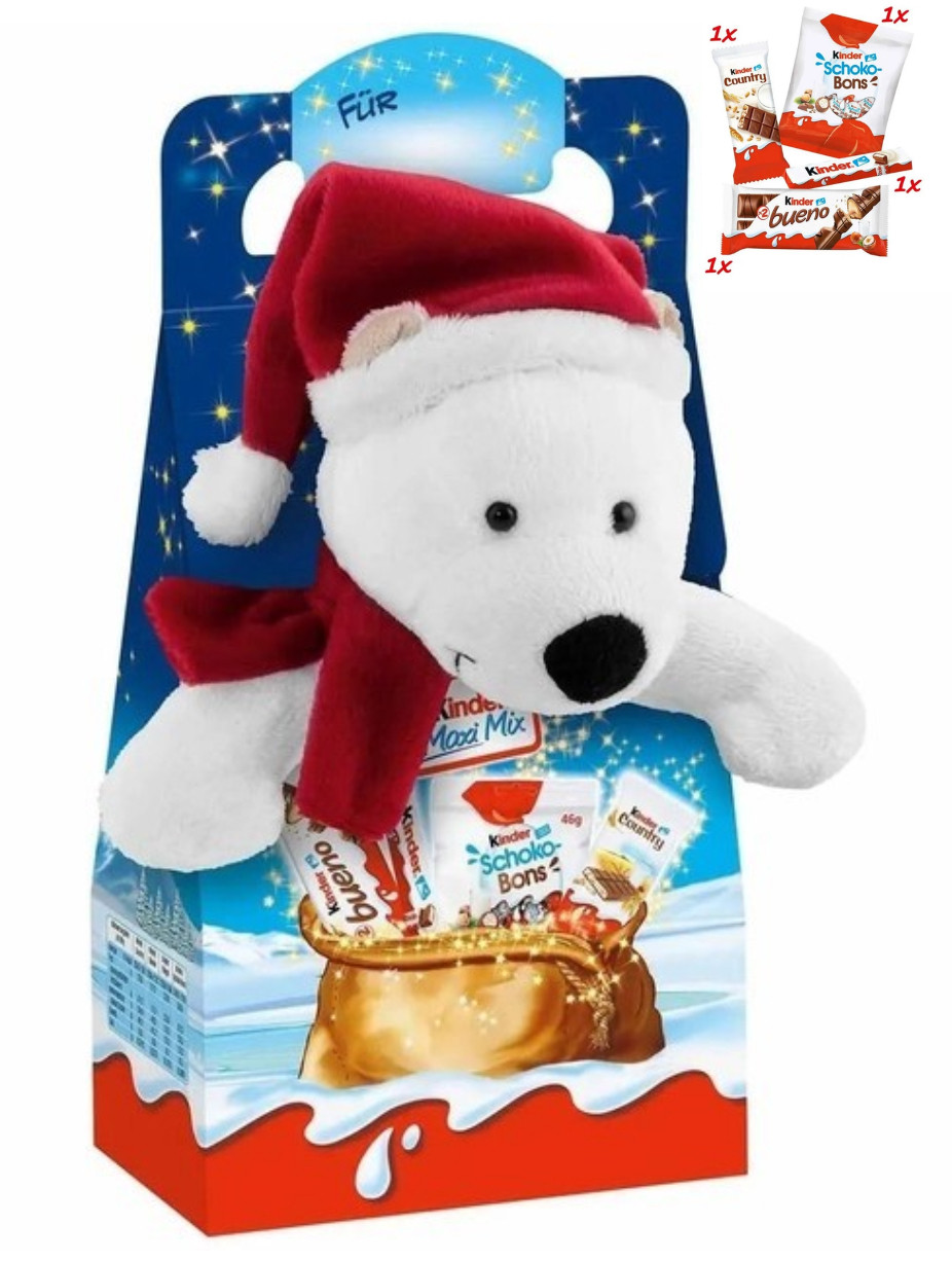 Перегляд Товару: Подарунок Новорічний Кіндер набір солодощів з мякою іграшкою Kinder Maxi Mix Білий Ведмідь 133г
