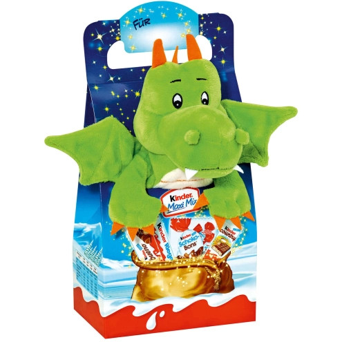 Перегляд Товару: Подарунок Новорічний Кіндер набір солодощів з мякою іграшкою Kinder Maxi Mix Зелений Дракончик 133г