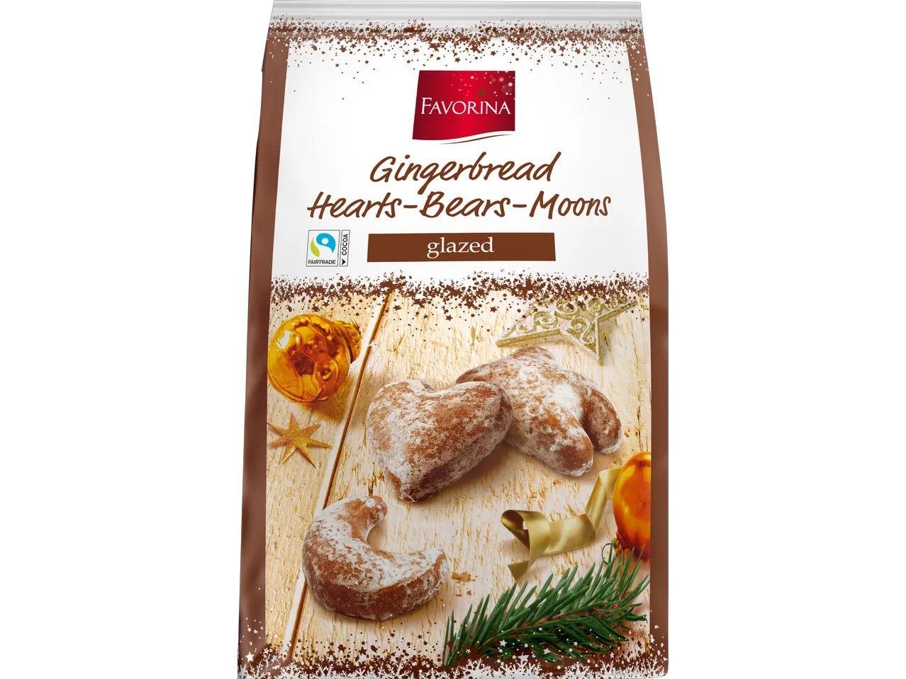 Перегляд Товару: Пряники імбірні Глазуровані Різдвяні Favorina Gingerbread Hearts Bears Moons Glazed Фаворні сердечка-ведмедики-місяці Пакет 500г