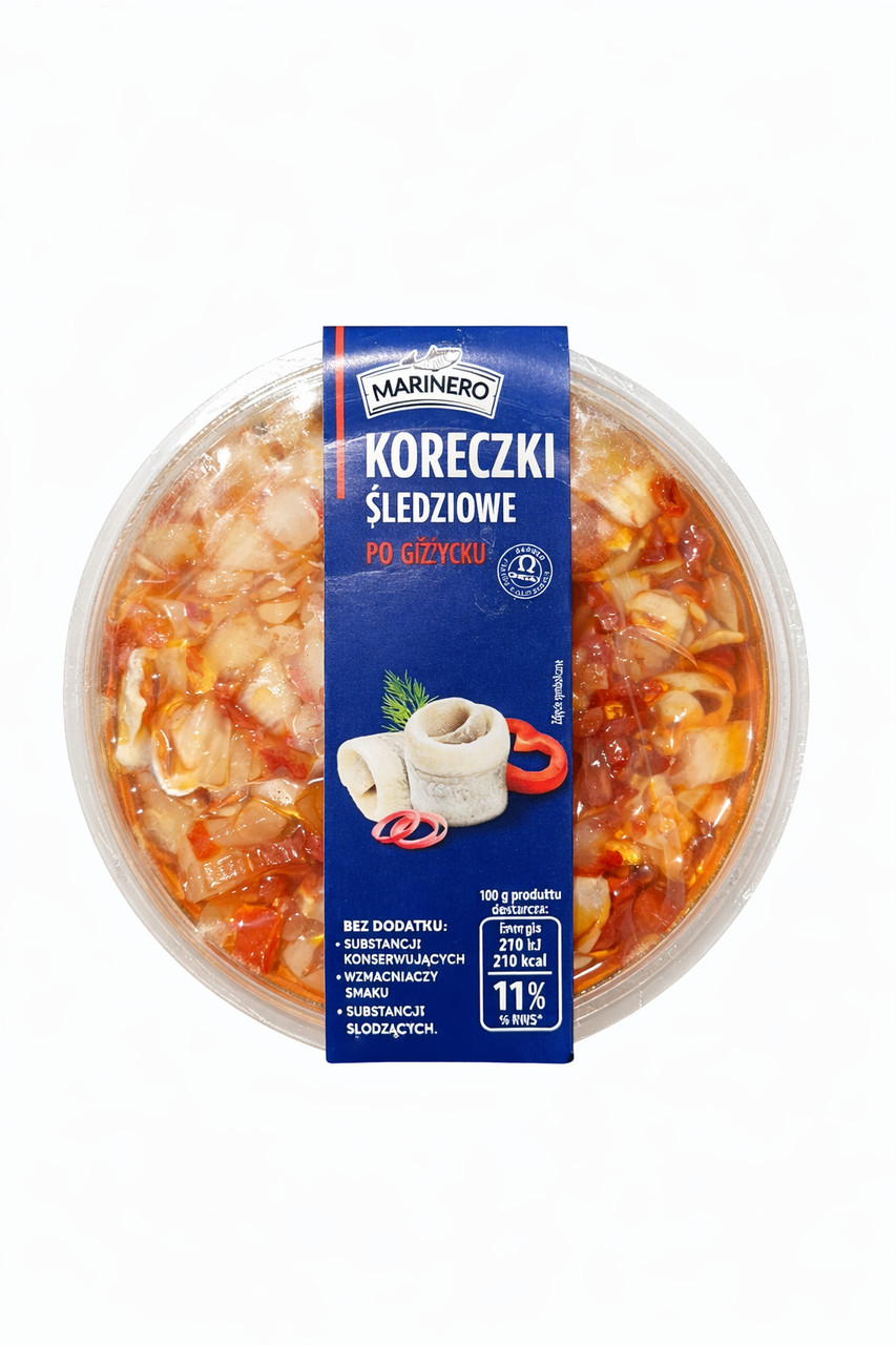 Перегляд Товару: Роли Оселедця Філе в Олії Marinero Koreczki Sledziowe po Gizycku Марінеро по-гіжицьки з паприкою та Цибулею Контейнер 250г