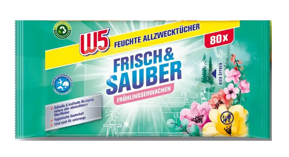 Перегляд Товару: Серветки вологі для Прибирання Універсальні W5 Multi Surface allzwecktücher Frisch&Sauber Frühlingserwachen В5 з Клапаном 80шт
