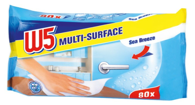 Перегляд Товару: Серветки вологі для Прибирання Універсальні W5 Multi Surface Wipes Sea Breeze В5 для мультиповерхонь з Клапаном Морський бриз 80шт