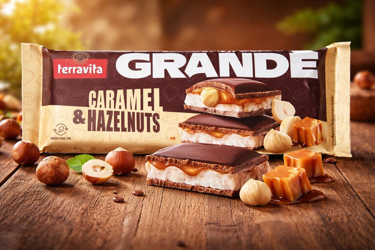 Перегляд Товару: Шоколад сендвіч Terravita Grande Caramel&Hazelnuts Теравіта Гранде молочний плитка Карамель та цілісний Фундук 235г