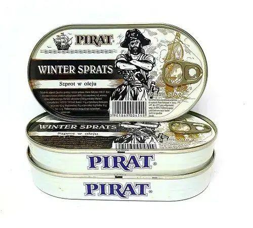 Перегляд Товару: Шпроти копчені Pirat Winter Sprats Szprot w oleju roslinnym Пірат рибки в рослинній олії Євробанка 170г
