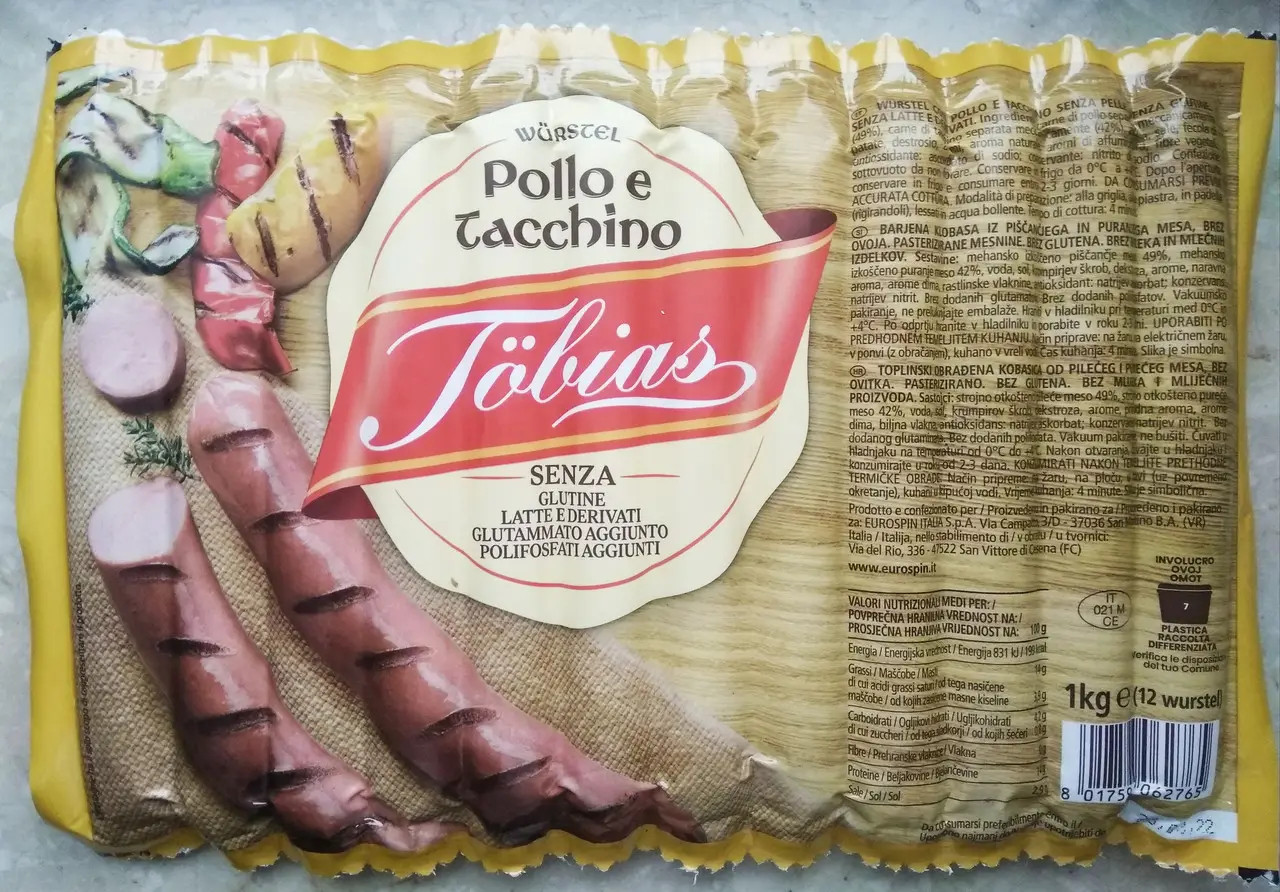 Перегляд Товару: Сосиски з мяса курки та індички Wurstel Pollo e Tacchino Töbias без глютену та лактози 10шт 1000г