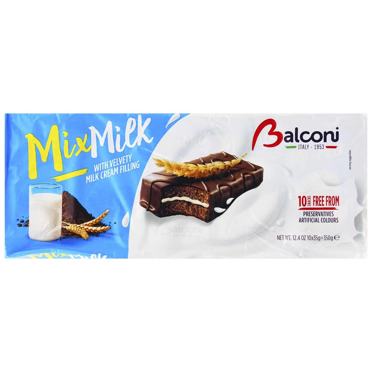 Перегляд Товару: Тістечка шоколадні бісквітні Balconi MixMilk milk cream з вершковим кремом 10шт 350г