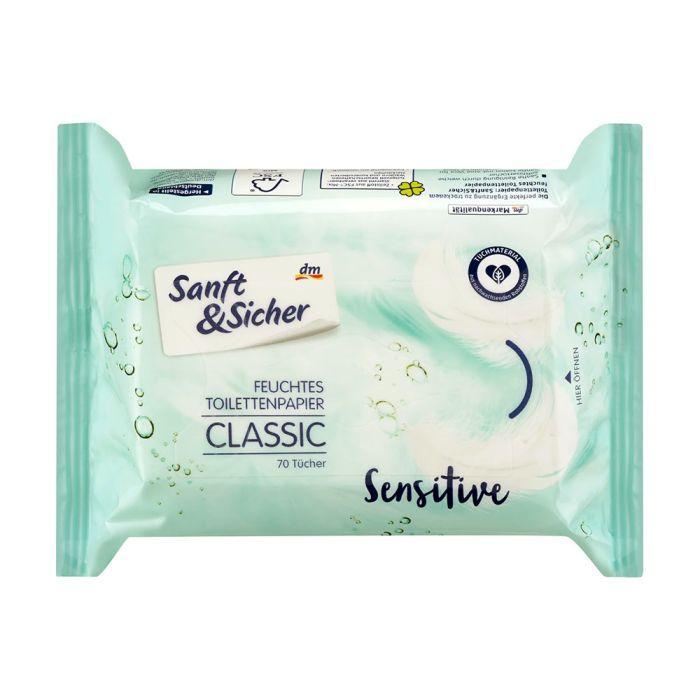 Перегляд Товару: Туалетний вологий папір Розчинний Сінсітів DenkMit Sanft&Sicher Classic Sensitive feuchtes Toilettenpapier для чутливої шкіри 70шт