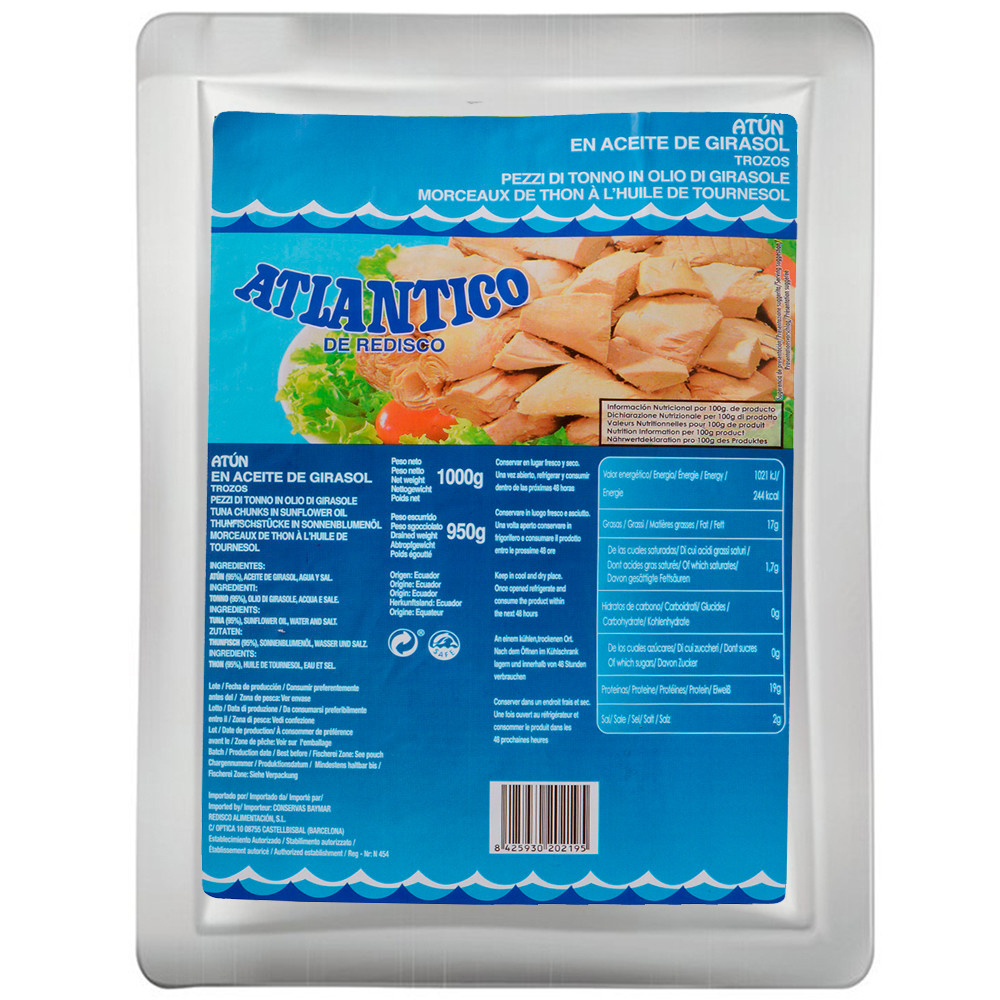 Перегляд Товару: Тунець шматочками Atlantico Tonno de Redisco Atun en aceite de girasol Атлантіко в соняшниковій олії Бігпак 1000г