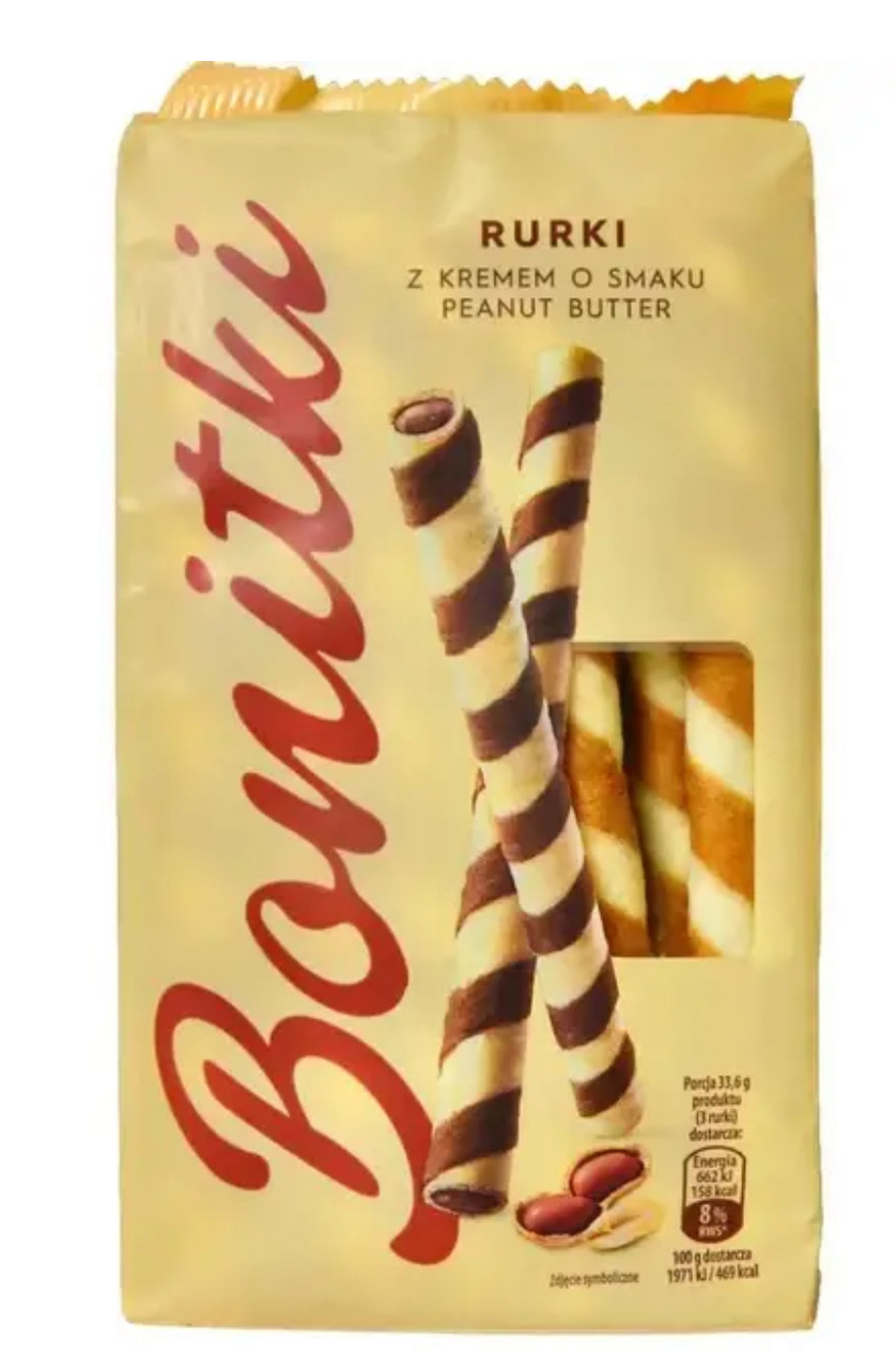 Перегляд Товару: Вафельні трубочки Руркі Biedronka Bonitki Rurki z kremem smaku Peanut Butter Боніткі Палочки з Арахісовим кремом 16шт 280г