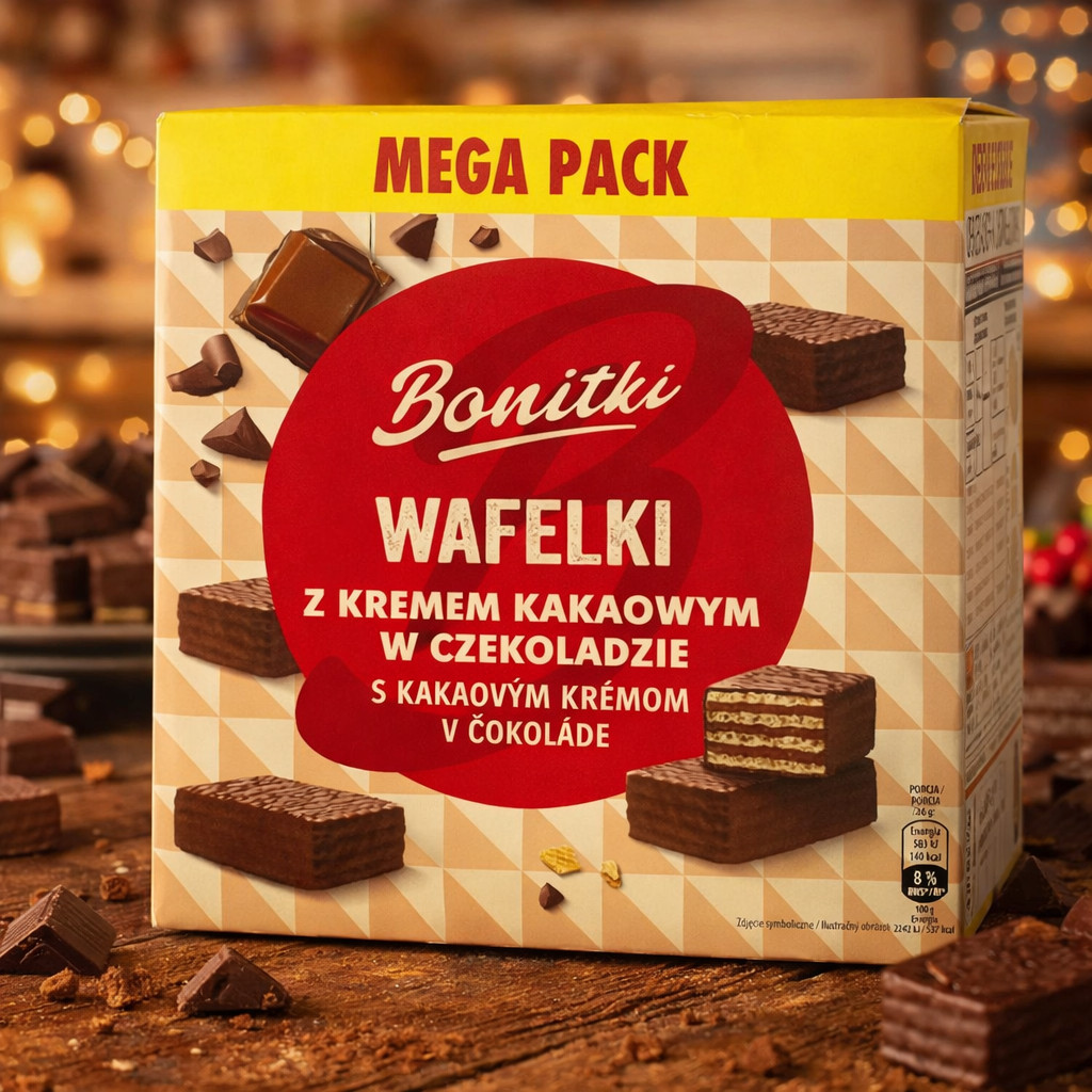 Перегляд Товару: Вафлі шоколадні вагові Bonitki Wafelki z kremem Kakaowym w czekoladzie Mega pack Боніткі з какао кремом Коробка 600г