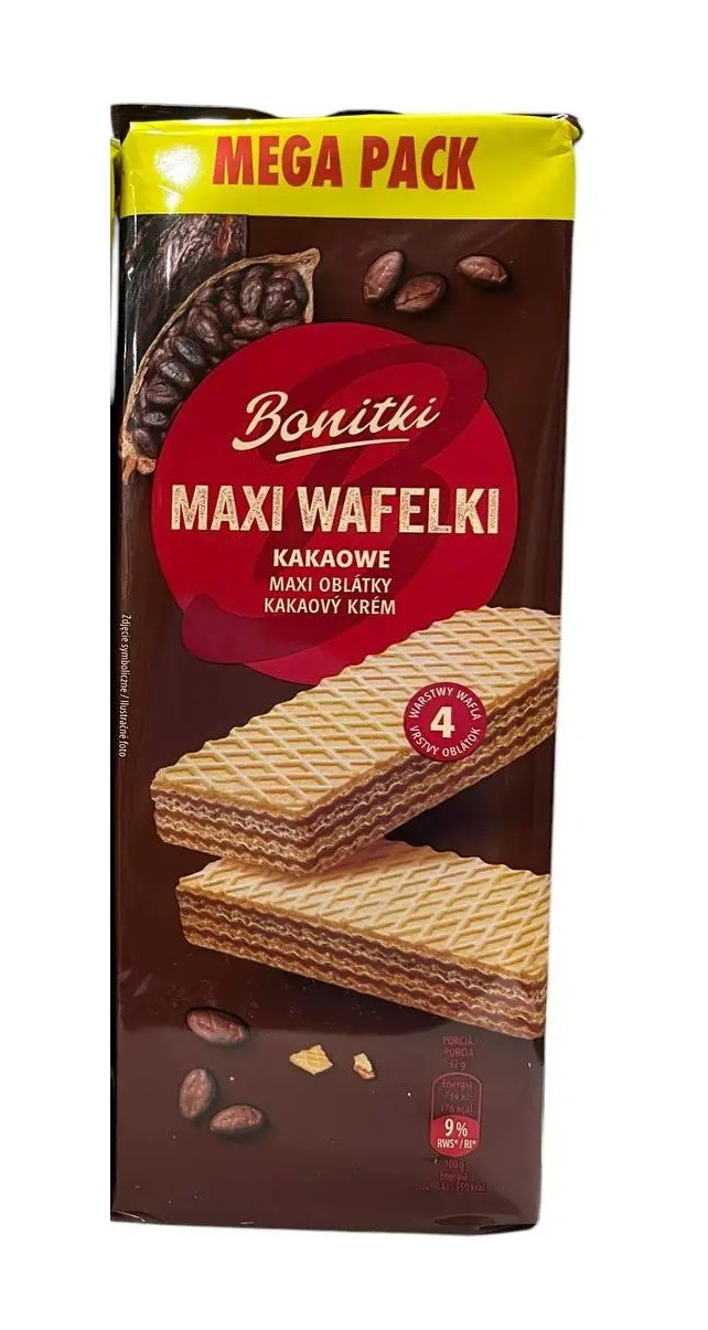 Перегляд Товару: Вафлі солодкі Biedronka Bonitki Maxi Wafelki Mega Pack Kakaowe Боніткі з какао кремом 10шт 450г