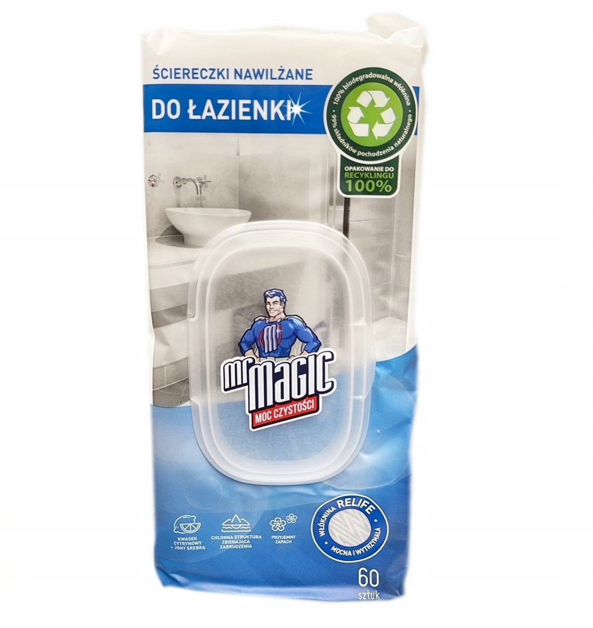 Перегляд Товару: Вологі серветки для Ванної Mr Magic do Lazienky лимонна кислота та іони срібла 60шт